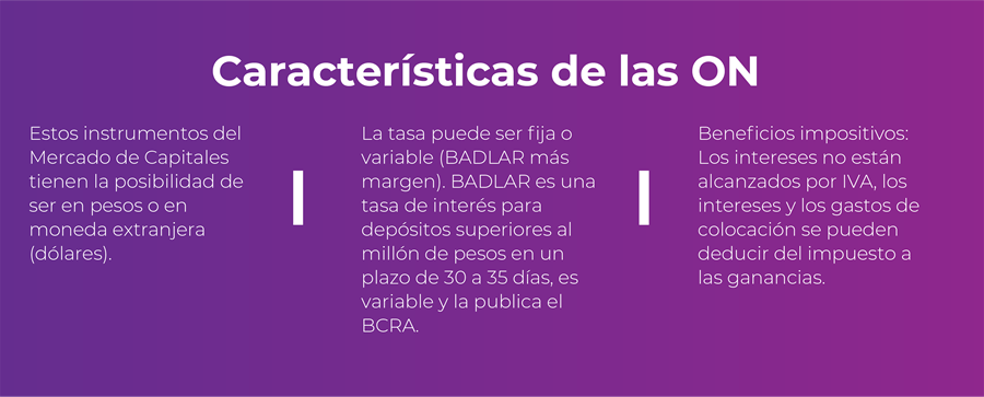 Son instrumentos de deuda emitidos por empresas privadas. Tienen una tasa de interés fija o variable y un plazo de pago determinados. Además, cuentan con términos y condiciones establecidos al momento de la emisión. Las ON se negocian en el mercado de capitales y son el equivalente a los bonos públicos, pero destinados a la financiación del sector privado.